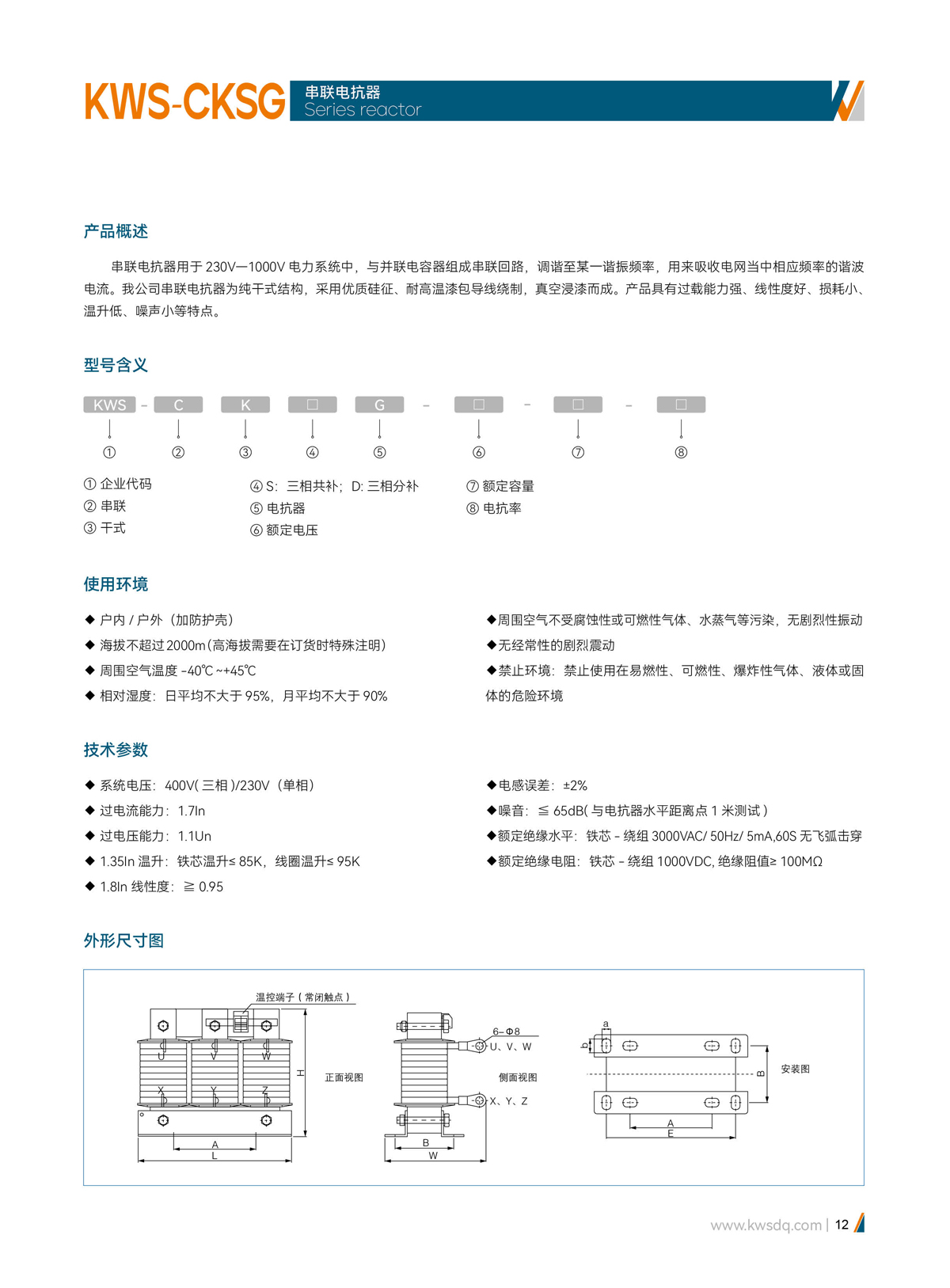 串联电抗器用于 230V-1000V电力系统中,与并联电容器组成串联回路,调谐至某一谐振频率,用来吸收电网当中相应频率的谐波电流。我公司串联电抗器为纯干式结构,采用优质硅征、耐高温漆包导线绕制,真空浸漆而成。产品具有过载能力强、线性度好、损耗小温升低、噪声小等特点。