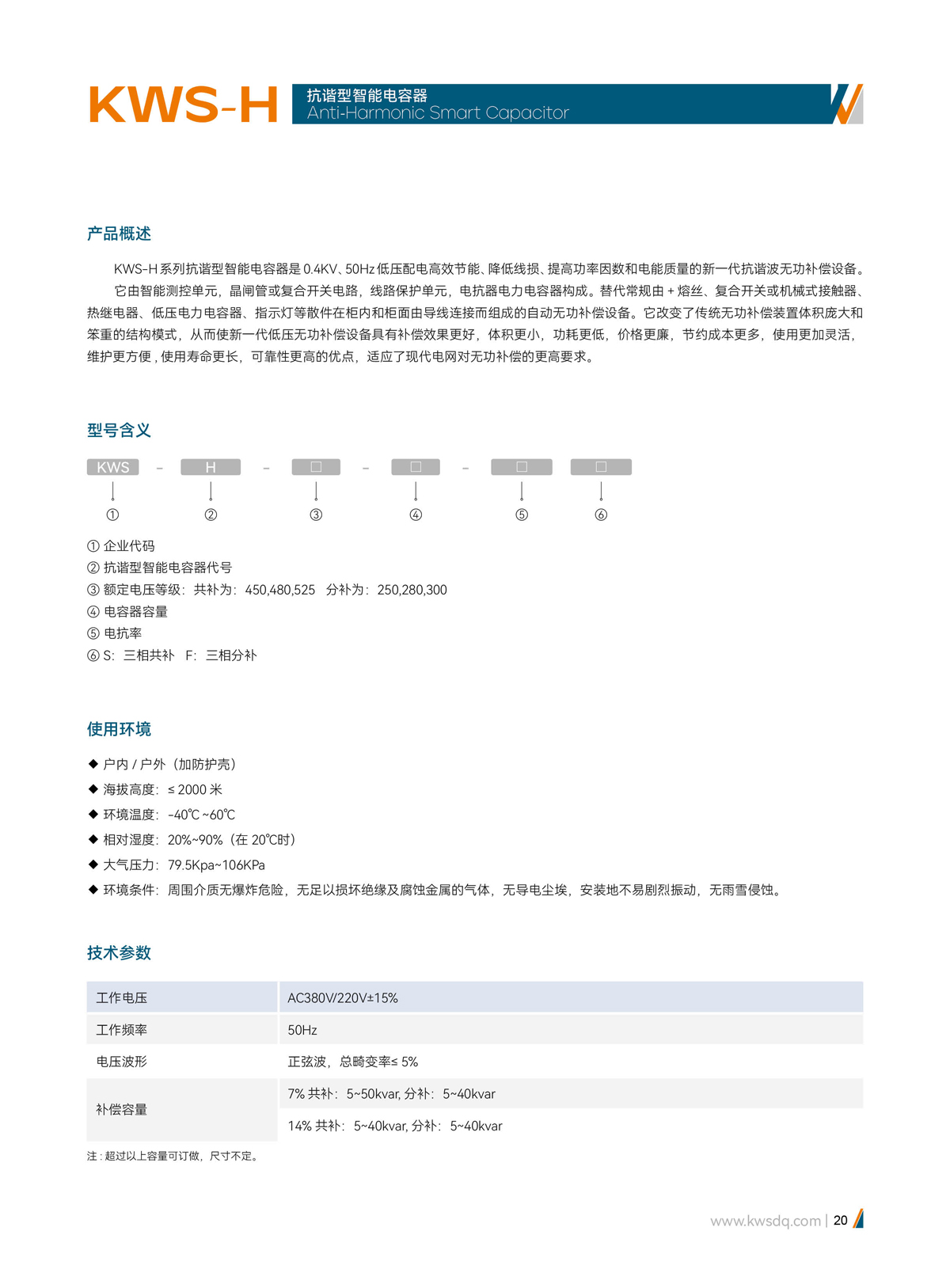 KWS-H系列抗谐型智能电容器是0.4KV、50Hz低压配电高效节能、降低线损、提高功率因数和电能质量的新一代抗谐波无功补偿设备。